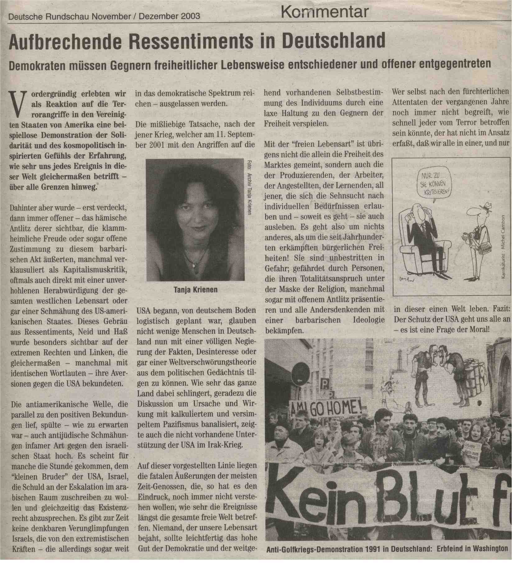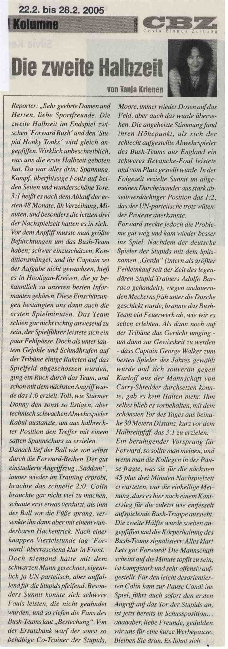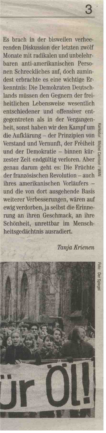 TK: (lacht): Und dich schicken sie dann in den Krieg, ja? Lass mal, wir wollen doch gewinnen! Nee, das ist auch Unsinn – bezüglich des Irak-Krieges wird sich nicht groß etwas verändern. Ich wünschte mir das anders, aber…na warten wir mal ab. Jedenfalls müssen wir auf mehreren Gebieten solche Tüten wie dich streng beiseite lassen und ein bisschen anziehen, z.B. bezüglich der Terrorismus-Bekämpfung, die schon im Innern anfängt.