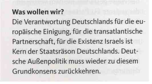 7. Das regierungsprogrammatische Bekenntnis der Unionsparteien zu der “Verantwortung Deutschlands … für die Existenz Israels” verdient (ungeachtet der minimalistischen Formulierung, die - für sich betrachtet - auch PDS, Grüne und FDP hätten unterschreiben können) im Kontext der Aufforderung, nach einem bundesdeutschen Regierungswechsel “wieder zu diesem Grundkonsens zurück[zu]kehren”, Anerkennung: Als Grundkonsens wird ein Grad der freundschaftlichen Beziehungen zwischen Deutschland und der jüdischen Republik postuliert, dem die paternalistisch sich gebärdende rot-grüne “Friedenspolitik” des Völkerbelehrers Joseph Martin Fischer NICHT in genügendem Maße Rechnung getragen habe.