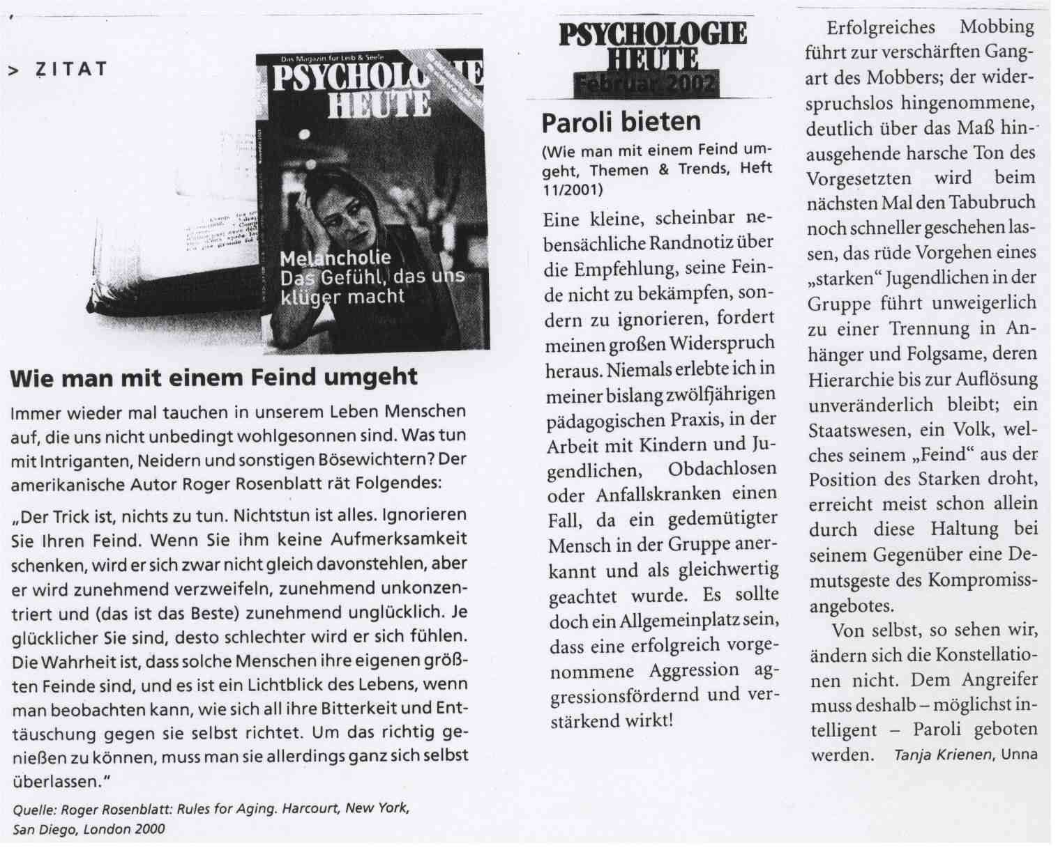 Würden, wie es Rosenblatt empfahl, die Prinzipien der Wehrlosigkeit weiter gefördert und damit der Instinkt der Selbsterhaltung, der vom Willen der eigenen Verteidigung lebt, untergraben, so wäre dies eine Vertiefung der negativen Zivilisationsgebrechen. Angriffe auf die Seele lassen immer Spuren zurück. Die Zulassung ungebremster, böswilliger Stiche in die Seele, in das Gemüt, in die Psyche, bewirkt eine Beschädigung des getroffenen Individuums, eine Schädigung, von der man gar verlangt, sie solle hingenommen werden und die angesichts der nicht helfenden Umgebung doch nur mehr schmerzt und bohrt, da sie doch zum privaten Problem herab bagatellisiert wird. Dabei ist es doch wie im wirklichen Leben, - ein Messerstich ist nicht zu vermeiden, in dem man ihn ignoriert!