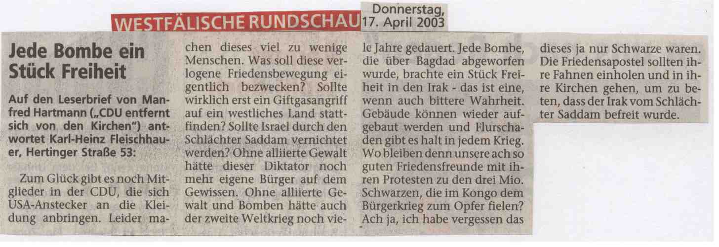 10. Wenn KHF allen Ernstes behauptete, jede Bombe, die über Bagdad abgeworfen wurde, habe “ein Stück Freiheit in den Irak” gebracht, so sollte nicht nur die Frage gestellt werden, ob er diese “eine, wenn auch bittere Wahrheit” einem durch eine solche “Freiheits”bombe verstümmelten irakischen Zivilisten glaubhaft nahezubringen vermöchte. Vielmehr muß in der Retrospektive darauf verwiesen werden, daß “gemäßigte” Islamisten insbesondere schiitischer Couleur durchaus allen Grund hatten, eine “Befreiung” von dem säkularistischen Baath-Regime zu erhoffen, das ihnen die Freiheit genommen hatte, ihre islamischen Werte und Normen Andersgläubigen zu oktroyieren. Darüber hinaus wurde sunnitischen Radikalen die “Freiheit” zuteil, “erfolgreich” religiöse Stätten der autochthonen christlichen Gemeinden im Zweistromland zu schänden, da - zum Unterschied von der Diktatur Saddam Husseins - die US-Besatzer und ihre irakischen Parteigänger nicht willens und in der Lage sind, irakische Christen wirksam vor ihren Verfolgern zu schützen.