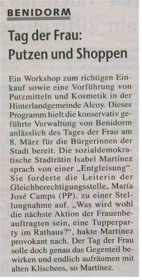 Die spanische PP hat deshalb Frauenbeauftragte, die den Namen auch verdienen und ein tolles Programm entwickeln, bei dem die wahren Frauenherzen schneller schlagen. Doch möchten die stämmigen Herzlosigkeiten allbewährter Sozialistinnen, angehörend sicher dem etwa siebten oder achten selbst erschaffenen Geschlecht (morgens früh weiblich, mittags männlich, nachmittags androgyn, abends universell, nachts sodomistisch usw. – am nächsten Tag in umgekehrten Reihenfolge) nun endgültig die Frau an sich abschaffen und „das Gegenteil“ etablieren. Besonders Frauen – freundlich erscheint ihnen wohl die Tätigkeit als Kranführerin, Bauarbeiterin oder Bodybuilderin. Lieblingssendung: Frauenknast. Lieblingszeitung: Emma. Lieblingszigarre: Havanna.