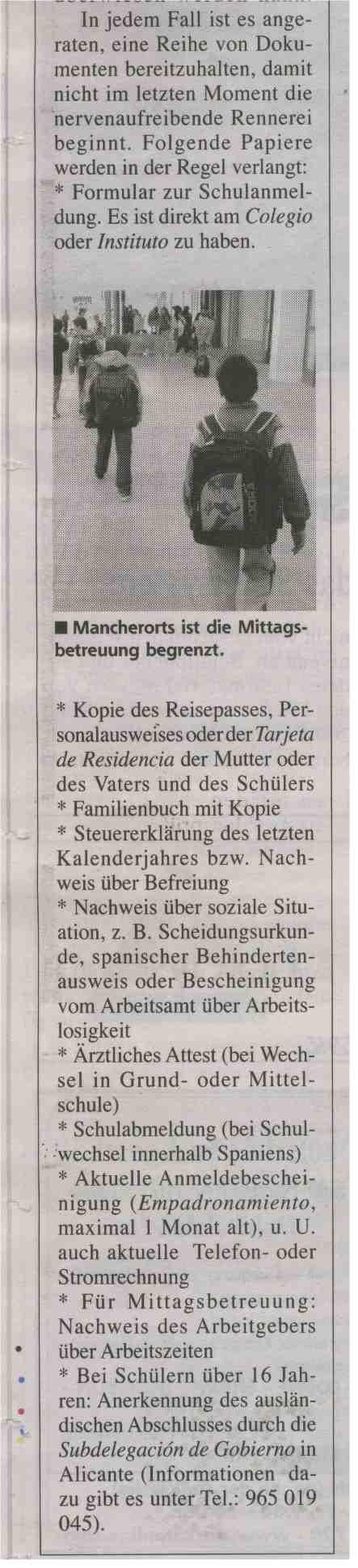 Spanien nach meiner Meinung bekanntlich objektiv nicht länger gehören kann und de facto nicht gehört, legt man als Zugehörigkeitskriterium „Zivilisation“ und „Recht“ zu Grunde). Hier lesen Sie, wie was man als Ausländer tun muss, um ein Kind in der Schule anzumelden:
