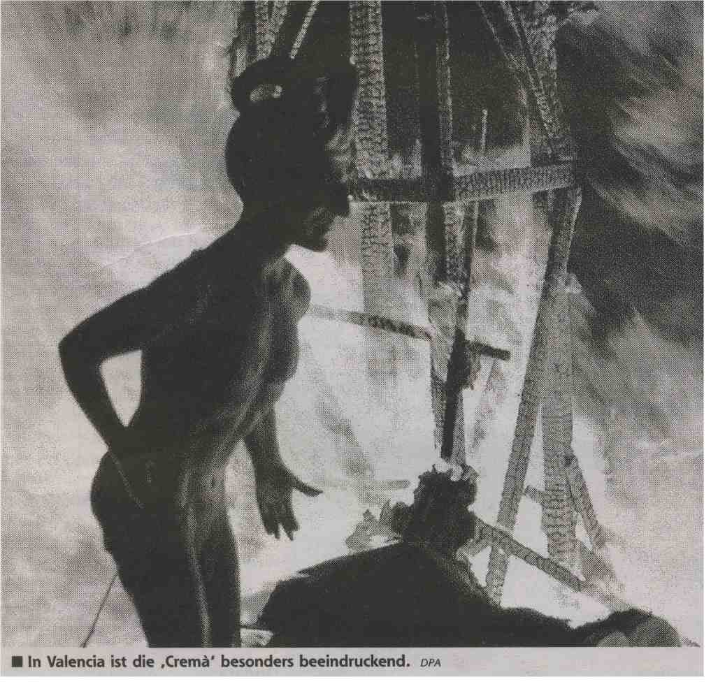Ach ja, man stellt ja nicht nur nach, die man heroisch die Mauren und Morisken (total assimilierte und nahe 1 ½ Jahrhunderte als solche lebenden Mauren) vertrieb und meuchelte (als Volksfest, vergleichbar mit dem Ausmaß der Schützenfeste in Deutschland), zudem brennen jedes Jahr die Puppen – bei den „Fallas“ hat man großen Spaß, wenn man schon einmal offiziell lärmen darf. Ursprünglich – vor nahezu 200 Jahren - verbrannte man Nachbildungen unliebsamer Personen, ehe dieser Brauch Ende des 19. Jahrhunderts vehement (völlig zurecht und noch zu zaghaft) bekämpft wurde. Unter Franco mäßig verbreitet, konnte der Pöbel in der Demokratie dann wieder offen leben, was er immer noch schlimmer will, als es die bekanntesten Diktatoren erlauben. Die Crema, ach ja, das ist die vom Crematorium!