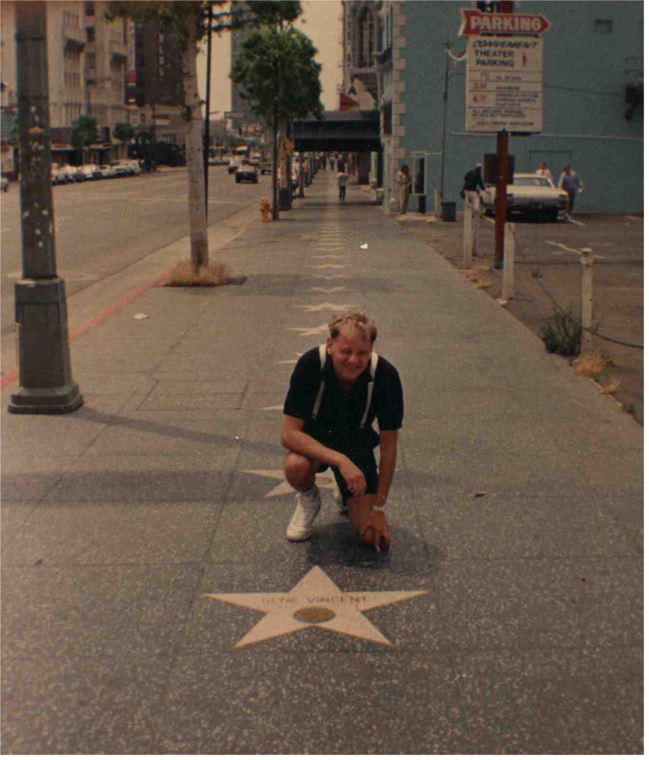 Gene Vincent (1935-1971) auf dem Hollywood Boulevard mit seiner obligatorischen Fußstütze (nach dem schweren Unfall 1962 bei dem Eddie Cochran starb.)