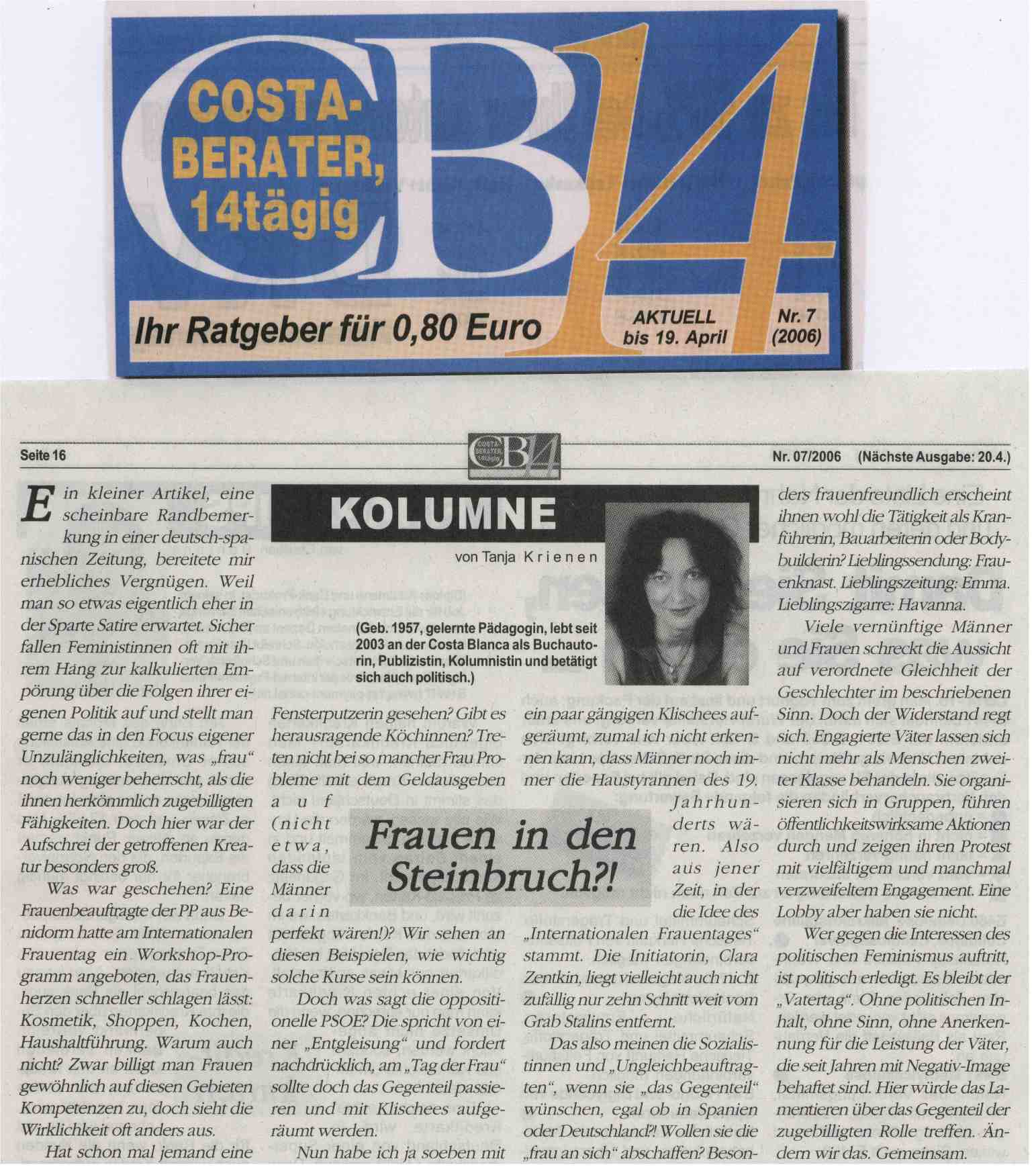 Ein kleiner Artikel, eine scheinbare Randbemerkung in einer deutsch-spanischen Zeitung, bereitete mir erhebliches Vergnügen, weil man so etwas eigentlich in der Sparte Satire erwartet. Sicher fallen Feministinnen oft mit ihrem Hang zur kalkulierten Empörung über die Folgen ihrer eigenen Politik auf und stellt man gerne das in den Focus eigener Unzulänglichkeiten, was „frau“ noch weniger beherrscht, als die ihnen herkömmlich zugebilligten Fähigkeiten. Doch hier war der Aufschrei der getroffenen Kreatur besonders groß.