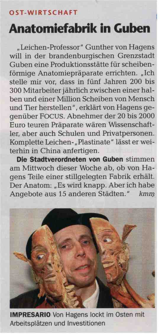 Über die Jahre hinweg habe ich immer wieder auf die Nivellierung der Moral, des Anstandes und des Menschen an sich, durch den Plastinator Gunther von Hagens hingewiesen auch in Print-Artikeln, wie z.B. im CAMPO Nr. 5/2004, doch nun ist er am Ziel. Meldete der FOCUS noch in seiner aktuellen Ausgabe: