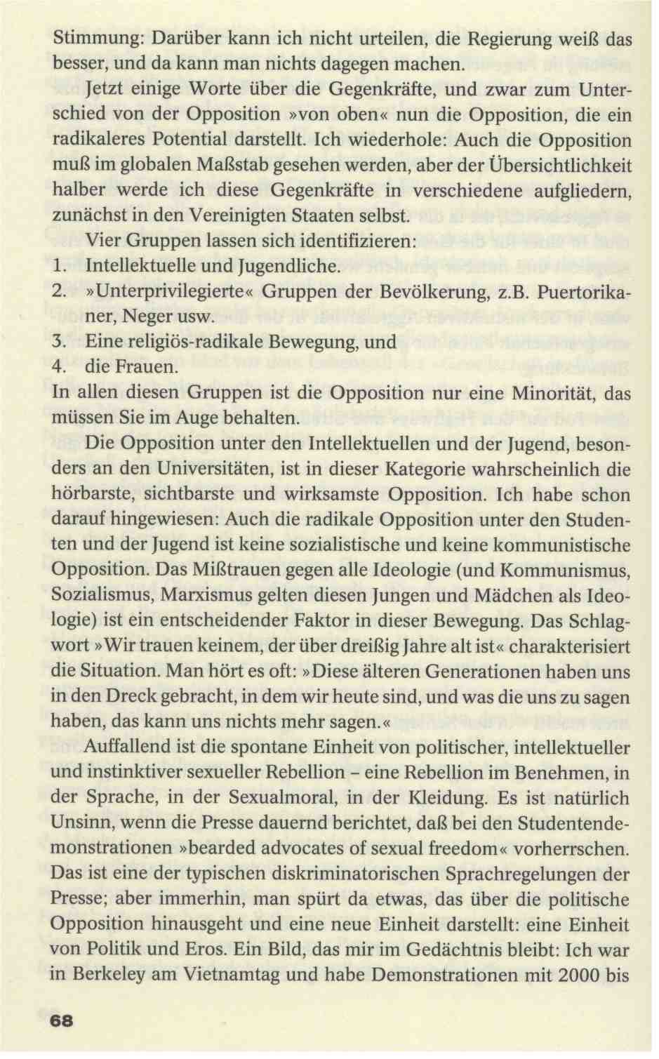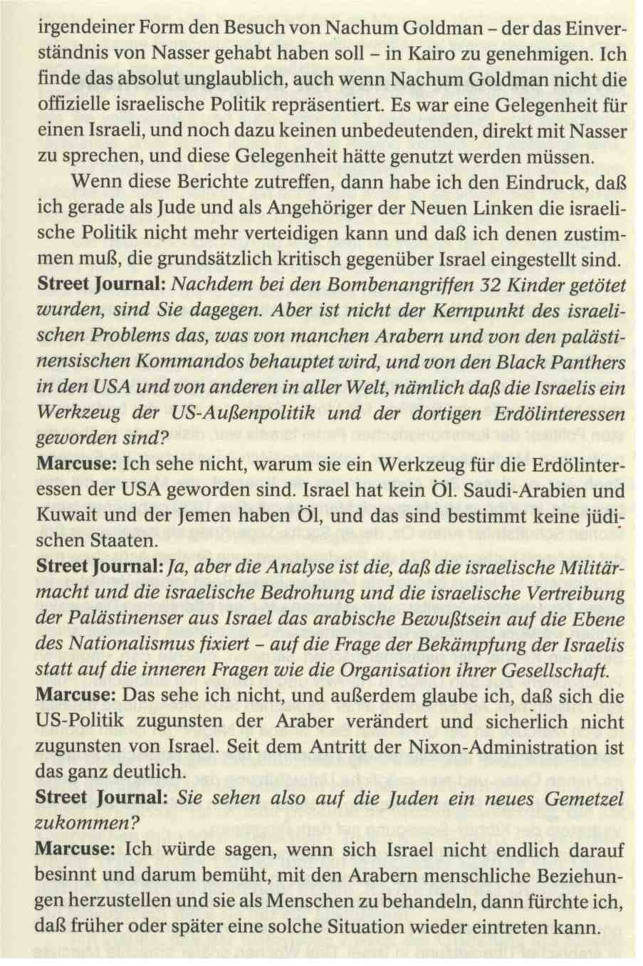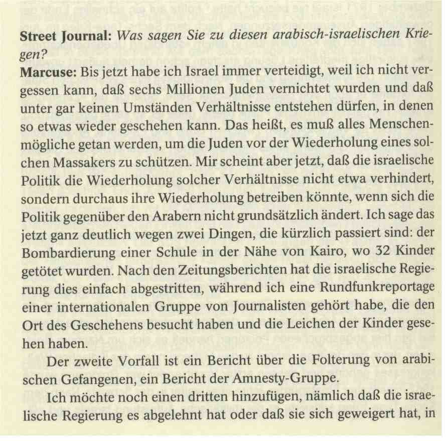 Hier ein Auszug aus einem erstmalig in deutscher Sprache veröffentlichen Interviews Marcuses mit dem “Street Journal” aus dem Jahre 1970 :