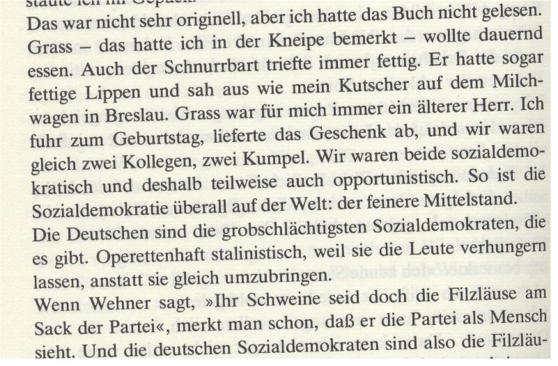 Ich habe Grass mal ein zwei Stunden kennen gelernt bei einem ARD Empfang. Grass war eben auch da, hat aber lieber mit mir und anderen Studies Faxen gemacht, Quatsch-Fotos im Nachrichtenstudio etc. Nicht unsymphatisch!