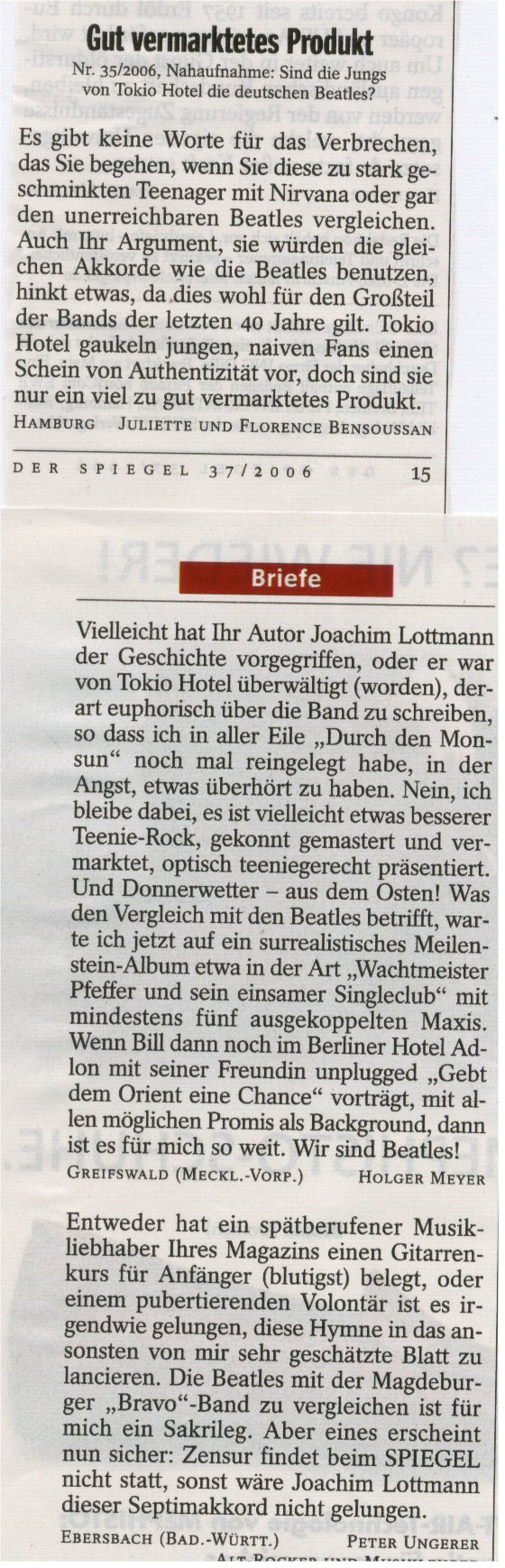 I wo, keine Rede davon. Das steht auch nirgendwo so im Text. Aber wie du ja sagst - es gibt einen “allgemeinen Tokio Hotel Disse” und da sollte man ruhig mal darauf aufmerksam machen, dass die Band erheblich besser ist als die meisten und durchaus einige originäre Sachen zu bieten hat. Natürlich war die Beatles-Musik viel artifizieller und vielfältiger und haben diese seinerzeit ihre Produkte auch selbst geschrieben. TK