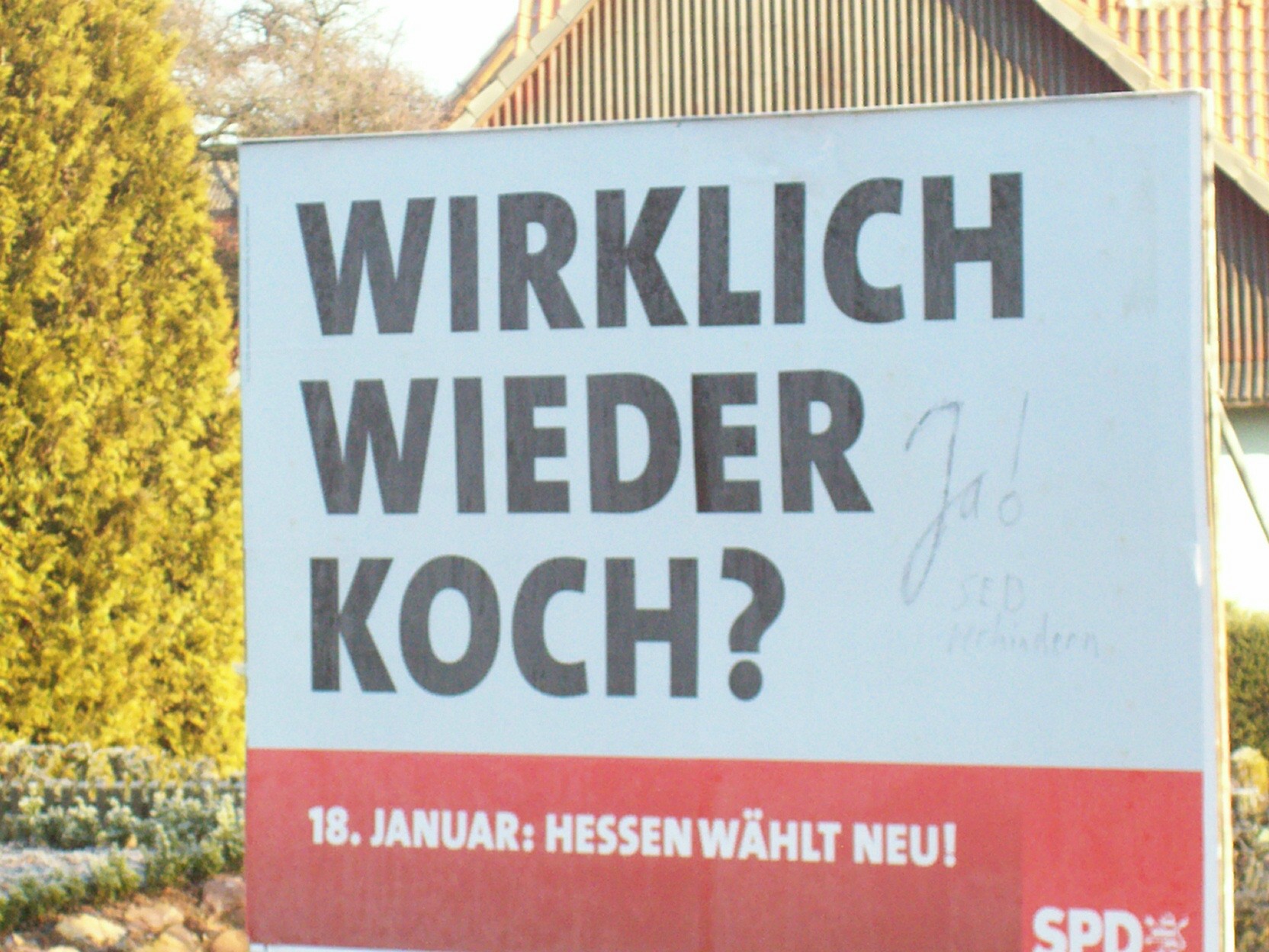 In meiner Stadt hat es jetzt einen schweren rechtsradikalen Vorfall gegeben, also etwa Nummer 12 000 in Deutschland! Da hat doch jemand auf das große, ziemlich weiße, aber dafür gut zum Beschreiben geeigneten Riesen-Plakat (ca. 5×3 Meter) am Orteingang, neben dem aufgedruckten SPD-Slogan „Wirklich wieder Koch?“, ein ganz zischer auf dem äußersten rechten Flügel ansässiger Mensch (ja ist denn der überhaupt als Mensch zu bezeichnen?), ein „Ja!“ aufgepinselt. Man stelle sich so etwas einmal vor! Straferschwerend kommt hinzu, dass der extremistische Übeltäter „SED verhindern“ darunter schrieb. Also so was! Kein Hammer und Sichel-Enblem, kein „Che lebt“, kein „Macht putt, was euch putt macht“, keine „Keine Macht für niemand, nur für Claudia Roth“, kein „Ypsilanti und Scheer, was will man mehr?“, sondern: „Wirklich wieder Koch? Ja! SED verhindern!“ Da muss doch sofort eine SOKO „Wachsames Waldeck“ einberufen werden!