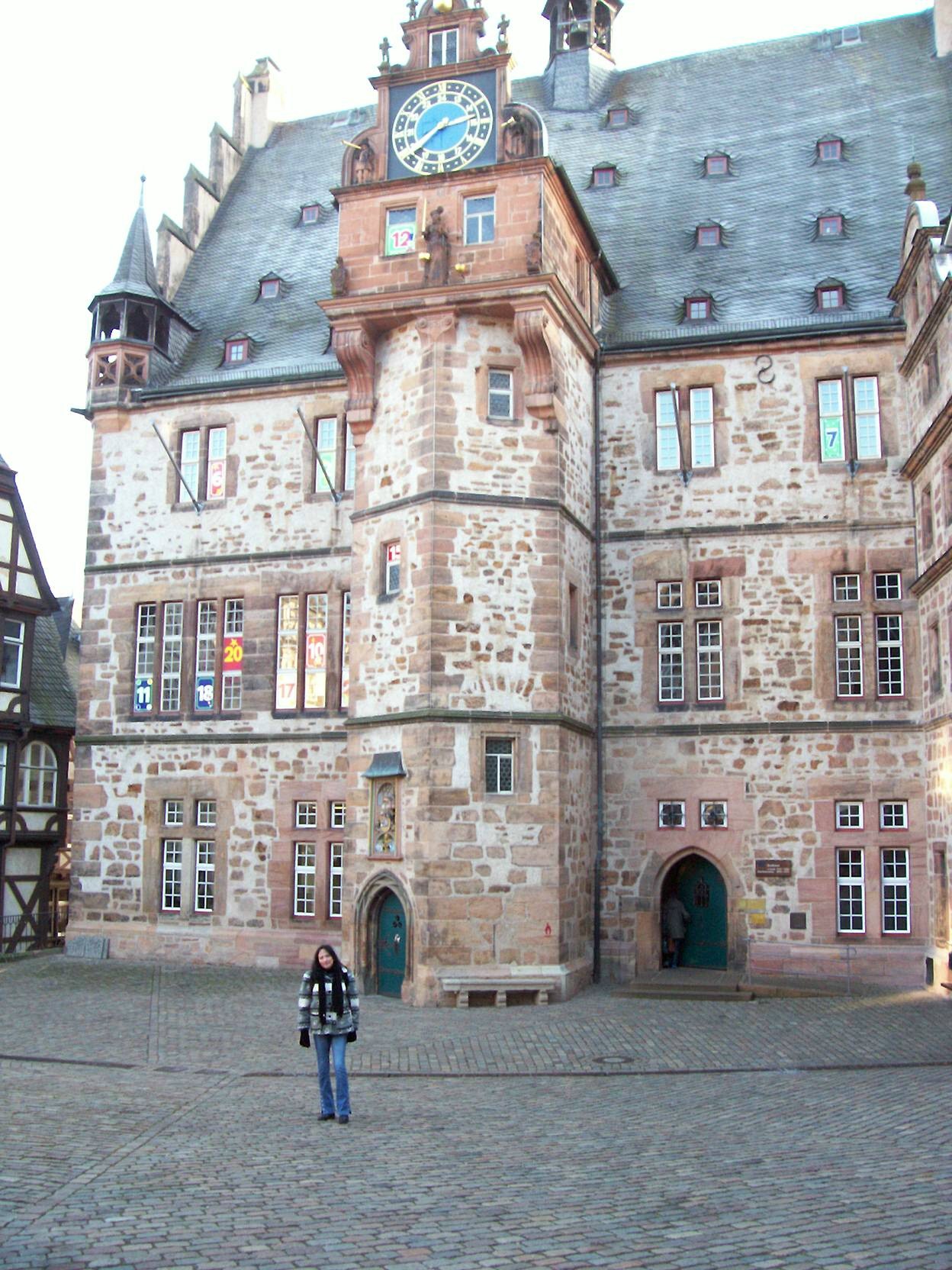 Zwar ist die Stadt noch immer nicht besonders gut für Fußgänger geeignet, aber sie wirkte gestern auf mich erheblich beeindruckender. Naja, so etwas ist halt auch von der Stimmung abhängig und im letzten Winter war diese nicht so gut. Objektiv aber ist Marburg eine schöne und interessante Stadt. Wie man die historische Altstadt von aggressiver Werbung freigehalten und überdies unzählige kleine Lädchen dort erhalten hat, ist schon beeindruckend. Mag auch der rechtswidrige Öko-Irrsinn, Stichwort „Solarsatzung“, aktuell ein Schildbürgerstreich sein, so hat das Stadtkonzept anscheinend bislang an den richtigen Stellen funktioniert. Warten wir ab. Anbei ein Foto mit mir (von KHF) vor dem hübschen Rathaus und noch eines, das die Topographie Marburgs veranschaulicht.