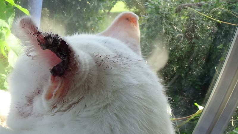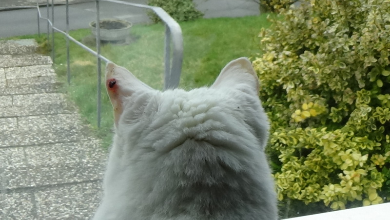 Das haben wir damals lang und breit debattiert. Die Ärztin meinte, es gäbe keine Gewissheit für eine Verbesserung, falls der Tumor streut. Und schau auf das andere Ohr, da haben wir dasselbe Problem. Das Ohr hinkt von der Entwicklung nur ein Dreivierteljahr hinterher. Und: die Narkose, der Eingriff an sich. Er hätte das Tier schon in die Knie gezwungen. Dann der Trichter um den Hals, damit es sich nicht an der frischen Wunde kratzt! Ein mehr als übler Zustand über Wochen: es kann nicht richtig fressen, stößt überall vor und liegt auch nicht beschwerdefrei. Alles Mist! So war es das Beste: es lebt noch ganz gut schon über ein halbes Jahr, frisst ordentlich und hat noch nicht abgenommen, schläft aber sehr viel und ist reduziert. Es ist 15 Jahre alt, das muss man bedenken und eine weiße Katze bekommt das im Alter sehr sehr oft. 10.10.21